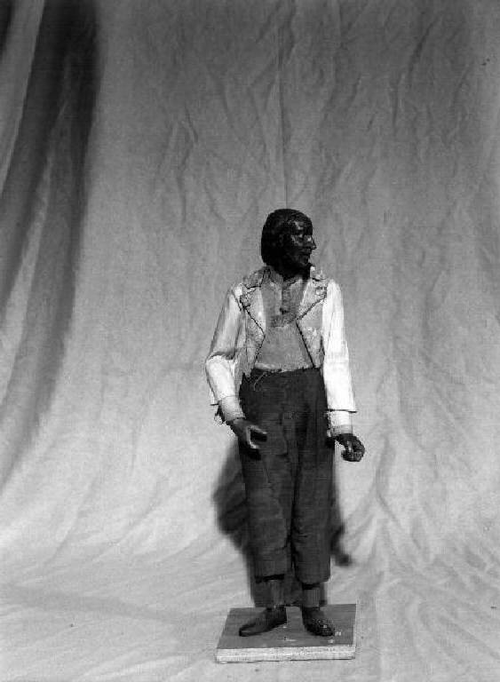 Statua da presepio.LEGNO SCOLPITO/ DIPINTO.VETRO POLICROMO.PELLE BIANCA/ TAFFETAS DI SETA BIANCO/ COTONE AMARANTO