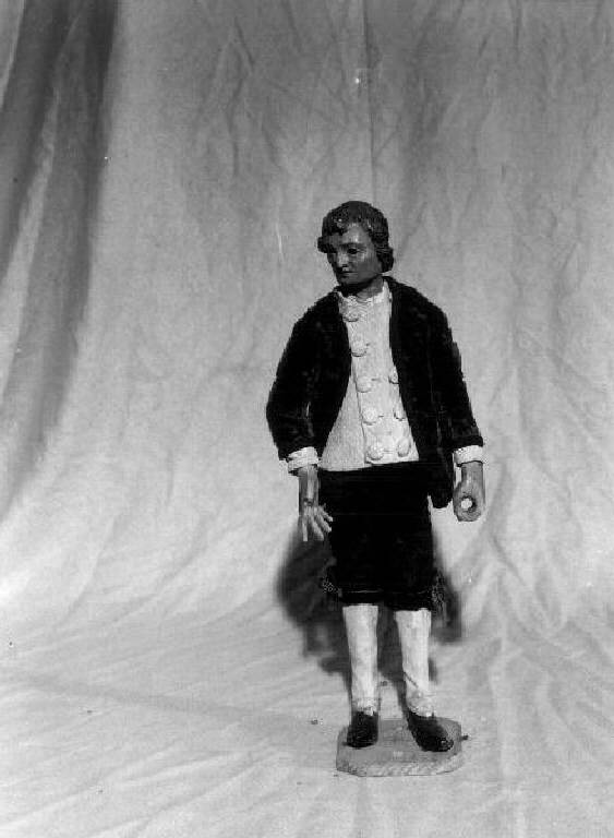 Statua da presepio.LEGNO SCOLPITO/ DIPINTO.VETRO POLICROMO.VELLUTO LISCIO BLU/ COTONE BIANCO.BOTTONI