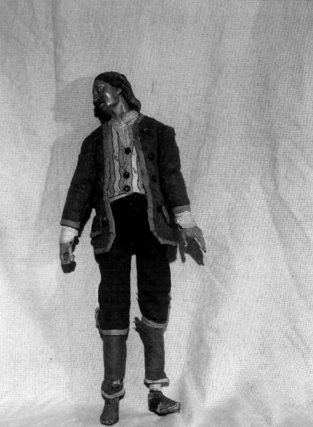 Statua da presepio.LEGNO SCOLPITO/ DIPINTO.VETRO POLICROMO.DAMASCO DI COTONE TURCHESE BROCCATO/ TELA VERDE/ RASO DI COTONE BEIGE.BOTTONI