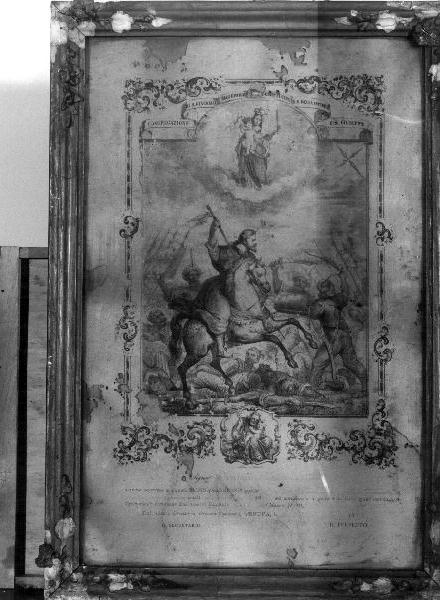 Personaggi: Madonna; Gesù Bambino; San Giacomo Maggiore a cavallo. Figure: guerrieri mori. Armi: lance