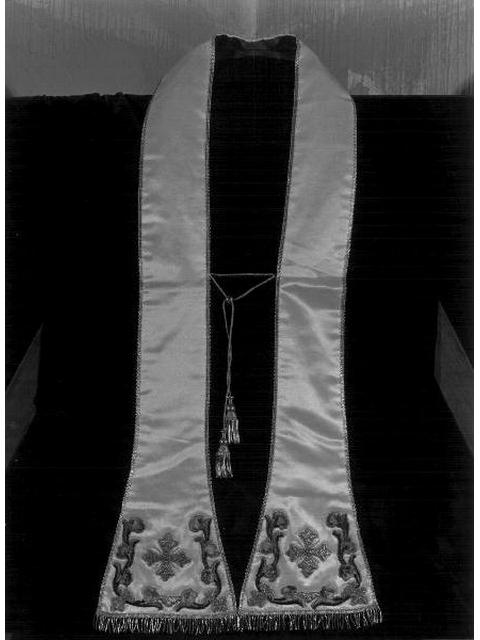 STOLA.TESSUTO SINTETICO BIANCO/ FILO DI SETA POLICROMO/ FILO DORATO.GALLONE IN FILO DORATO.FODERA IN COTONE ROSSO (RICAMO RIPORTATO)