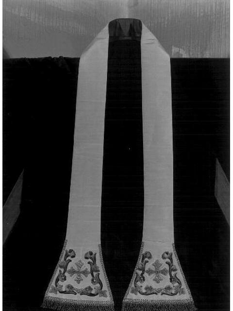 STOLA.GROS DE TOURS DI SETA BIANCO RICAMATO IN FILO DI SETA POLICROMO FILO DORATO.GALLONE IN FILO DORATO.FODERA IN COTONE CREMISI