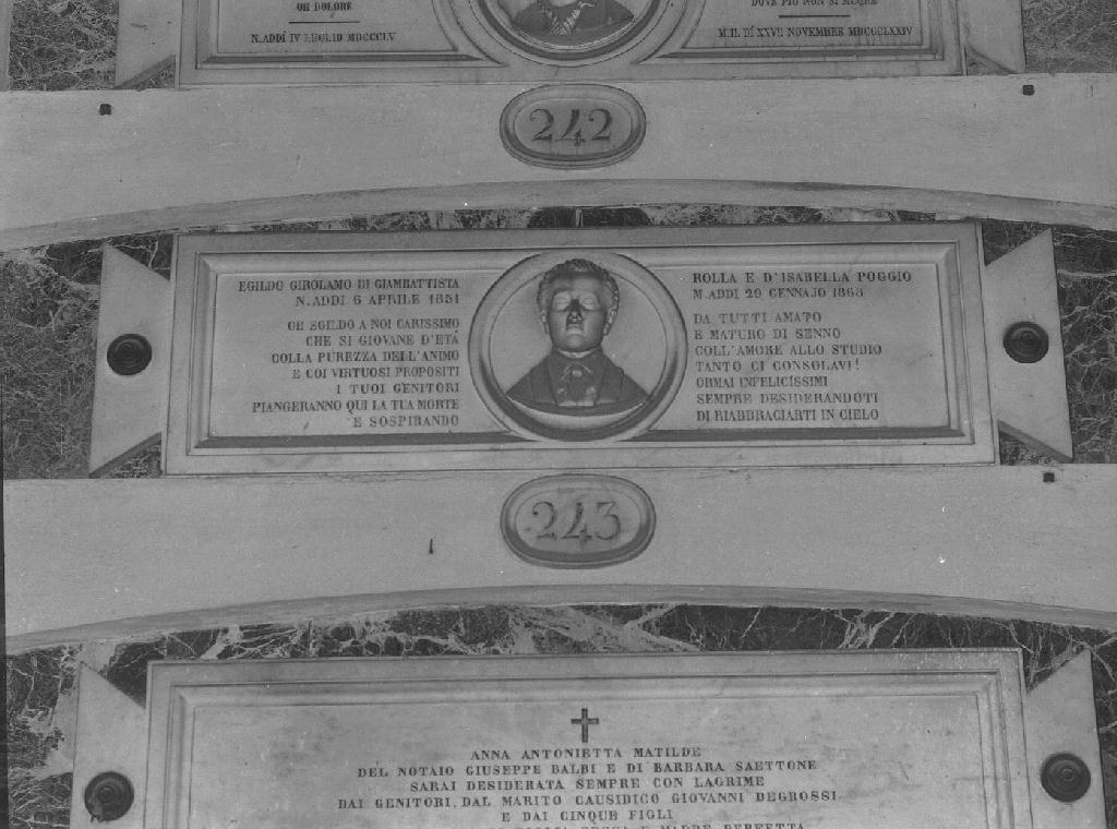 - ISCRIZIONI A SINISTRA - ROLLA E D'ISABELLA POGGIO/ M. ADDI 20 GENNAJO 1868/ DA TUTTI AMATO/ E MATURO DI SENNO/ COLL'AMORE ALLO STUDIO/ TANTO CI CONSOLAVI !/ ORMAI INFELICISSIMI/ SEMPRE DESIDERANDOTI/ DI RIABBRACCIARTI IN CIELO - lettere capitali - a solchi -
