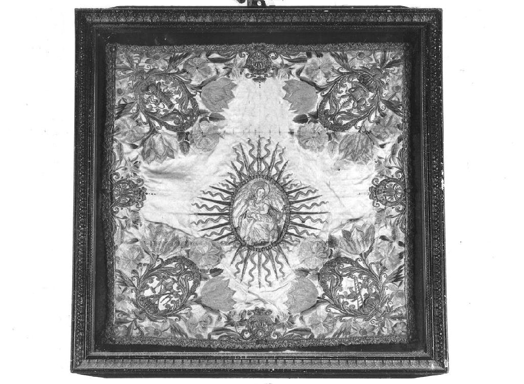 - NOTIZIE STORICO CRITICHE Interessante e pregevole velo di calice ricamato assegnabile per caratteristiche stilistiche alla produzione ligure della prima metà del sec. Xvii.L'oggetto è probabilmente identificabile nell'inventario dei beni della chiesa del 1905 dove viene così citato: "quadro di seta ricamato (gobelin),ritenuto del 1500, di valore inapprezzabile"