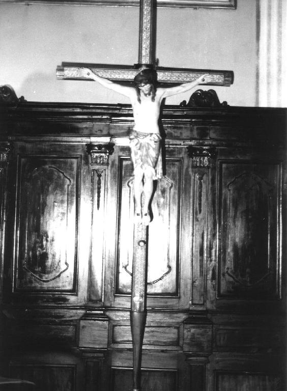 Figura di cristo( alta 110 e larga 92.5 ) intagliata e scolpita a tutto tondo in legno dipinto. Croce lignea con applicazoni in argento a motivi vegetomorfi