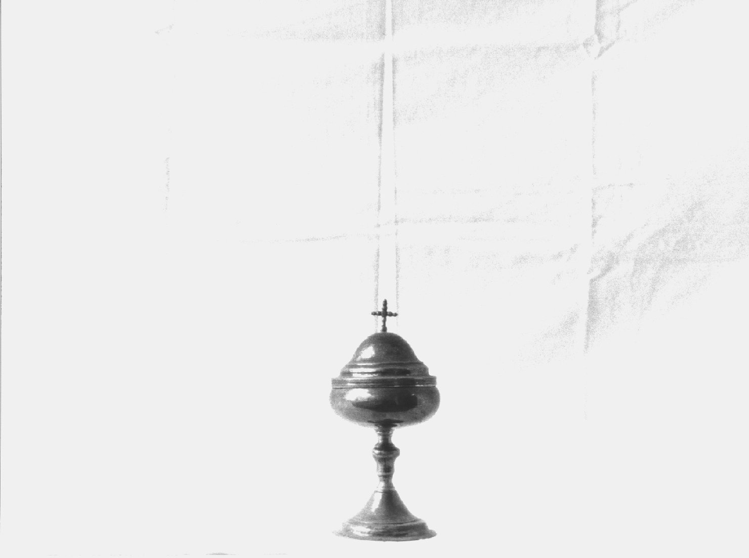 PISSIDE IN ARGENTO CON INTERNO DORATO. IL COPERCHIO E' SORMONTATO DA UNA PICCOLA CROCE A NODULI