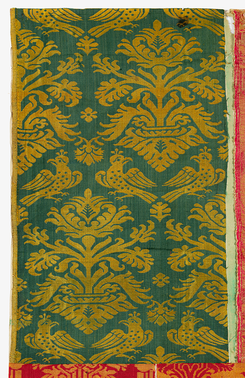 Damasco base raso da 5 bicolore per orditi in seta verde e trame in seta un filo verde e uno giallo. Presente cimosa destra (0.7 cm). Taffetas delle trame verdi e gialle con orditi giallo crema e cordellina di lino all’estremità attorno cui girano tutte le trame. Decoro per palmette composite ogivali con stelo centrale e anello alla base, circondato da due volatili addossati, i cui corpi generano nella successione del pattern un effetto di maglie