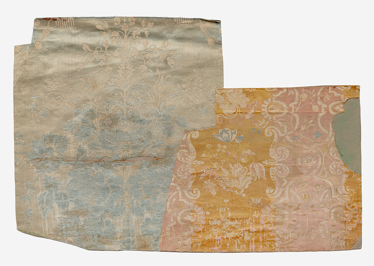 - NOTIZIE STORICO CRITICHE Il decoro di gusto neoclassico e le cromie permottono di datare il tessuto tra la fine del XVIII e il principio del XIX secolo. Secondo l’antico assetto collezionistico della raccolta Bruzzo i frammenti 278 e 279T sono incollati insieme su un unico cartoncino sagomato, acquarellato in verde. Vecchio numero di inventario 90. I frammenti erano stati probabilmente riuniti per analogie di decoro e epoca