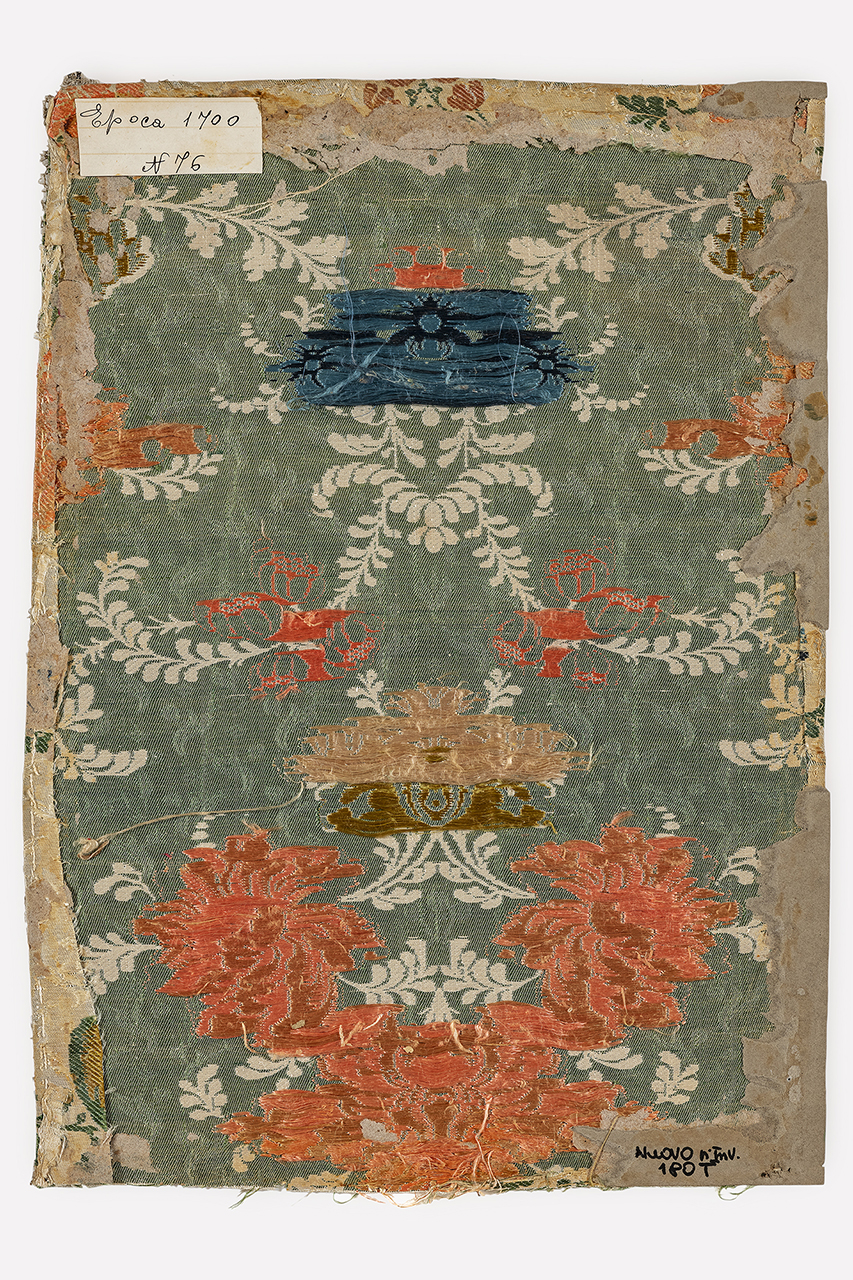 Telo in taffetas liseré lanciato e broccato. Sul fondo avorio, campito da piccoli motivi tono su tono resi tramite slegature della trama di fondo, si dispongono rami ricurvi verdi portanti grandi fiori simili a peonie rosa, boccioli, fiori più piccoli rosa e altre infiorescenze a cinque petali blu. Tutte le parti verdi del disegno (rami e foglie) sono ottenute con una trama lanciata in seta verde legata al fondo a liages repris in diagonale che, essendo inserita ad ogni passo, conferisce al tessuto un aspetto di gros de Tours. Corolle e petali dei fiori sono broccati in sete policrome legate in diagonale sul dritto e slegate suo retro e presentano effetti di sfumature e particolari naturalistici