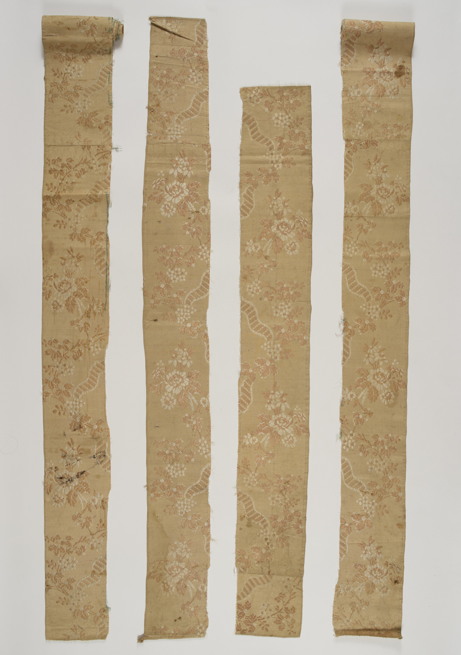 Quattro frammenti di forma irregolare in cannellé simpleté (ordito di fondo e di pelo in seta rosa pallido, trame in seta un colpo avorio e uno rosa), liseré. È presente la cimosa (0.6) composta da 10 fili avorio attorno cui girano le trame. Su un fondo rosa pallido a coste per effetto di armatura corrono intrecciati un motivo a nastro ondulato ad andamento verticale rosa e avorio con campitura interna a sbarrette diagonali lisce e con ovuli e un tralcio ondulato ad andamento verticale con fiori rosa e avorio. Nelle anse ulteriori mazzolini di rose e margherite