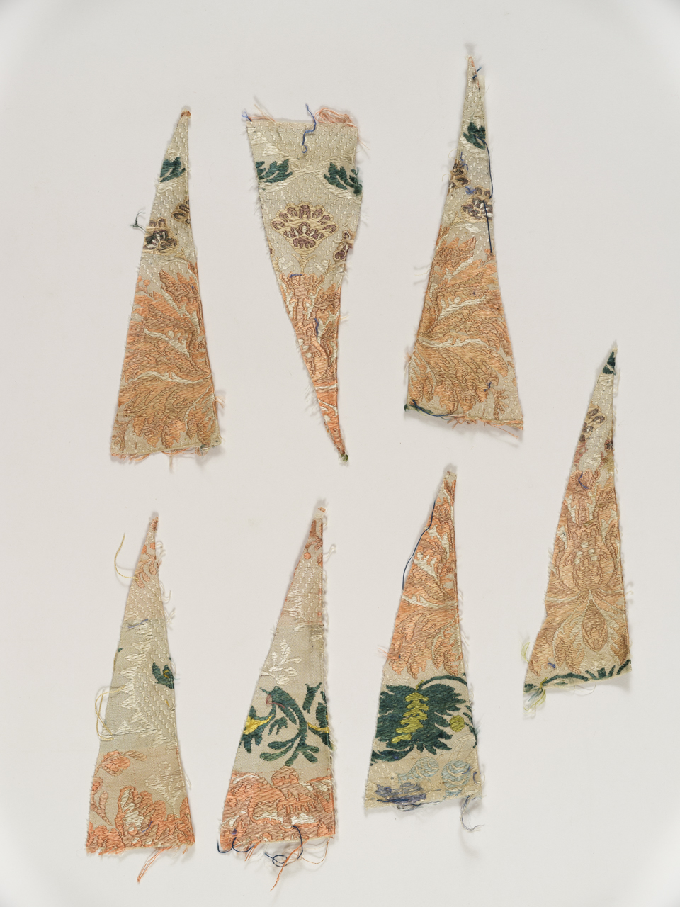 7 frammenti di lampasso (fondo taffetas per ordito e trama in seta avorio), liseré, lanciato in seta policroma (trame lanciate varianti rosa in più toni, giallo, verde, azzurro e blu fermate per passata in saia da 3 lega 1 Z faccia trama da un ordito di legatura in seta bianca). Su fondo avorio con motivi a nastro tono su tono di controfondo si dispongono motivi floreali con steli e foglie policromi