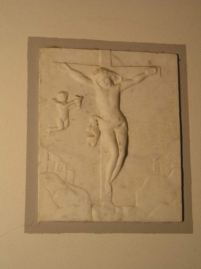 RILIEVO MARMOREO RAFFIGURANTE, AL CENTRO, GESU' CROCIFISSO. SUL LATO SIN E' UN ANGIOLETTO IN VOLO, CHE REGGE IL CALICE. NELLA PARTE INFERIORE, A BASSISSIMO RILIEVO, SONO RAFFIGURATE DELLE ROCCE, SULLE QUALI SONO DELLE ABITAZIONI E UNA CHIESA