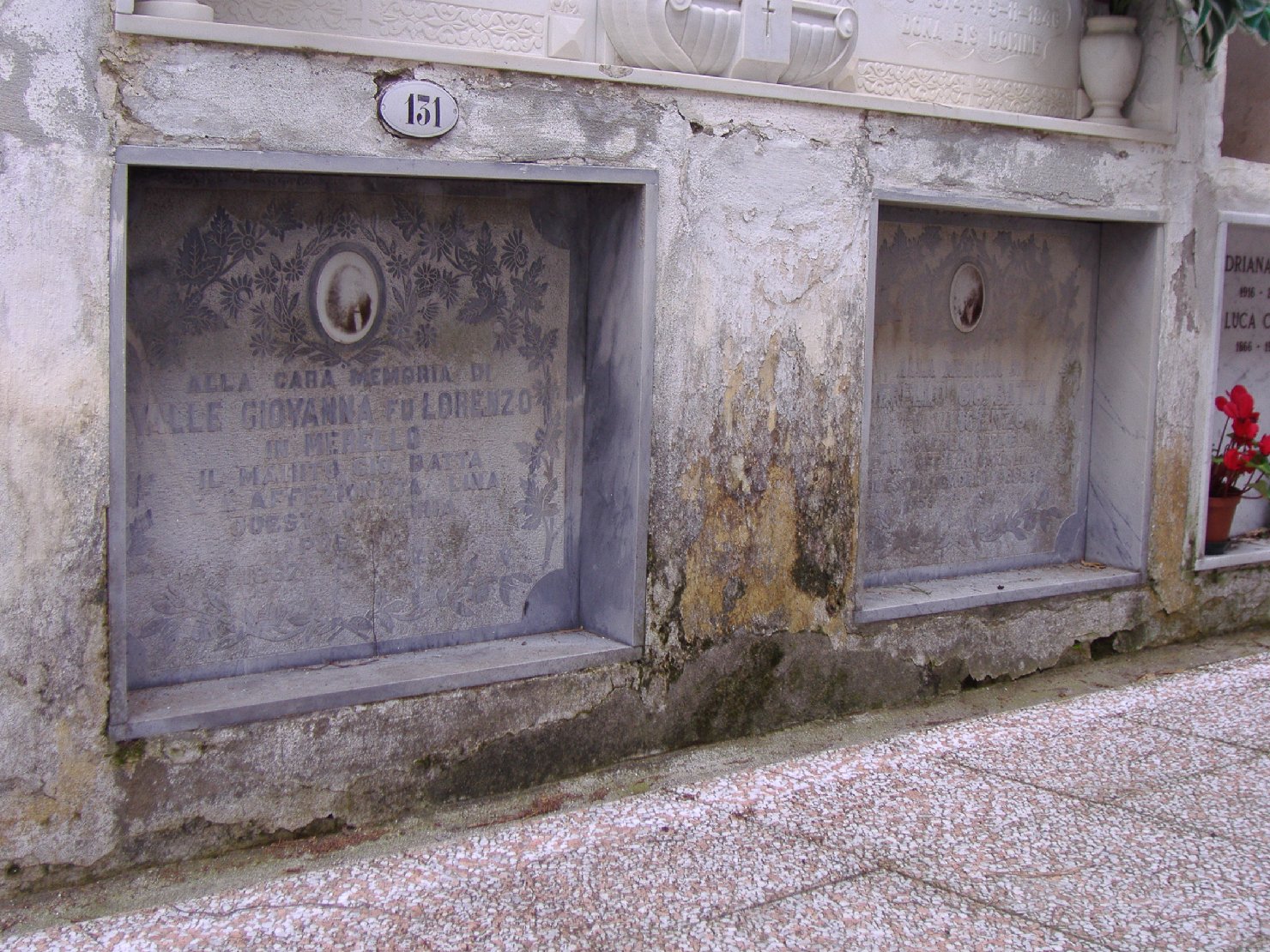 - ISCRIZIONI Al centro del loculo sinistro - Alla cara memoria di/ Valle Giovanna fu Lorenzo/ in Merello/ il marito Gio Batta/ e l'affezionta Lina/ questa memoria/ posero/ 1867 + 1942 - lettere capitali - a rilievo -