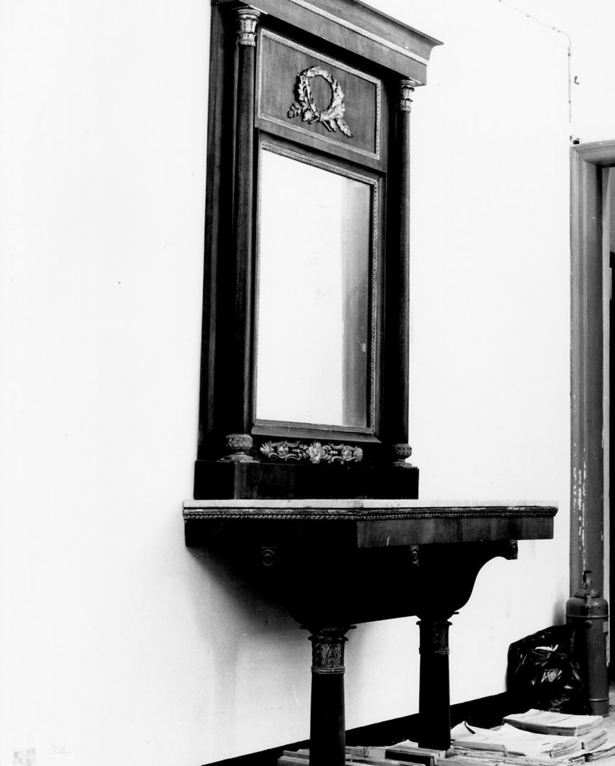 - NOTIZIE STORICO CRITICHE Consolle neoclassica con base sostenuta da grandi e tozze colonne scanalate in legno e oro e specchiera con esili colonnine ai lati e capitello corinzio, sul modello di manufatti diffusi a Genova tra fine '700 e inizio '800 (cfr. Gonzales Palacios 1996, figg. 356-357). La coppia di consolles rientra in una tipologia ricorrente di stile Impero e non presenta particolari caratteri di specificità che la facciano ritenere opera di produzione locale. La datazione di entrambi gli oggetti è da stabilirsi fra gli ultimi anni del XVIII secolo e l'inizio del successivo. Dall'Inventario della donazione risulta che le due consolle erano collocate, come oggi, al penultimo piano del palazzo