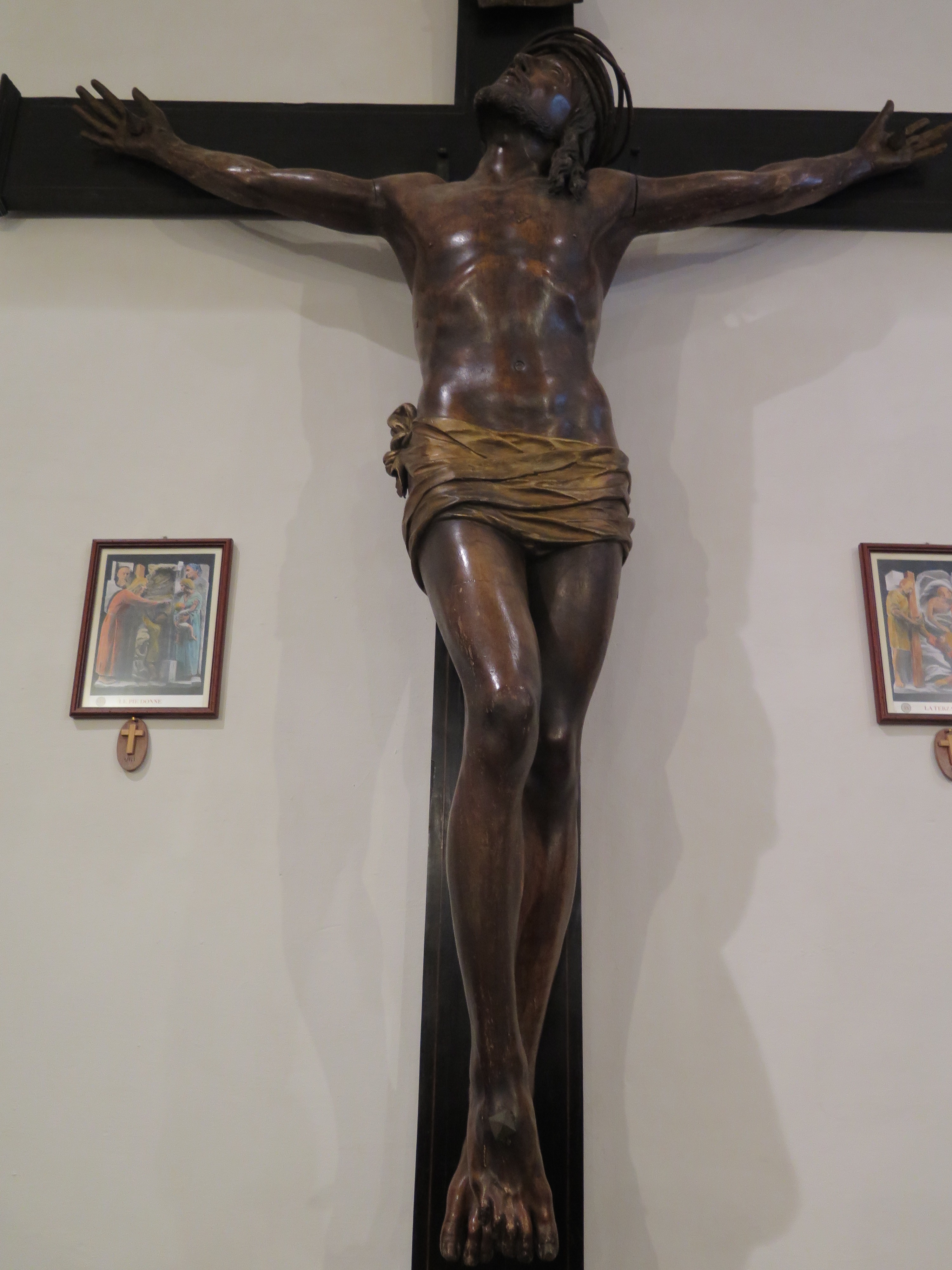 Questo Crocefisso ligneo costituisce una delle opere più importanti tra tutte quelle presenti nell’Oratorio, oltre che uno dei soggetti più presenti nel culto, nonostante le note difficoltà conservative delle sculture lignee e il deperimento del materiale di produzione. L’assenza di elementi stilistici connotanti impedisce di identificare scuole, botteghe o singoli artisti. Risulta facile ipotizzare, comunque, la matrice di una scuola o bottega locale, che ha saputo interpretare e rielaborare motivi ed espressioni di maestri intagliatori nordici. Il materiale utilizzato è il legno locale, probabilmente noce; la tecnica è la grande manualità degli artigiani. La testa di questa scultura presenta un ovale perfetto ed allungato, leggermente inclinata all’insù, in segno di devozione a Dio. Le occhiaie appaiono leggermente incavate, le sopracciglia arcuate, il naso perfetto ed affilato, le mandibole rivestite da una folta ed ordinata barba. I capelli, lunghi e ondulati, ricadono leggermente sulla spalla sinistra. Il corpo si presenta in posizione frontale, dentro un chiaro schema simmetrico, senza particolari sinuosità. I pettorali e le ondulazioni delle costole sono realistici; il tronco piatto acquista volumi sull’addome e sul bacino; le braccia, lunghe e distese lungo gli assi oriz