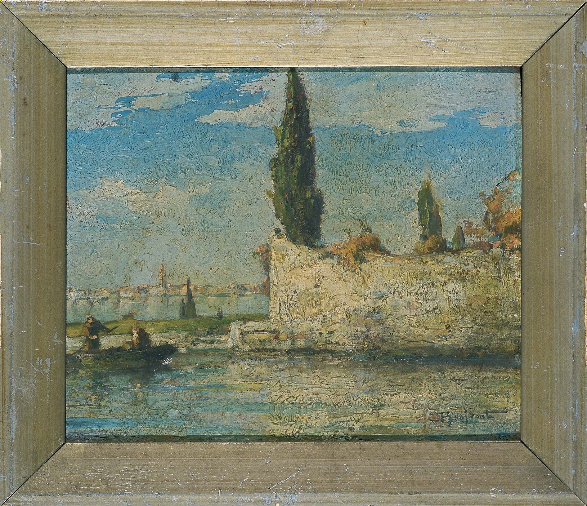 Dipinto su compensato raffigurante un paesaggio lagunare e l'isola di San Francesco del Deserto, che ospita un convento di frati minori