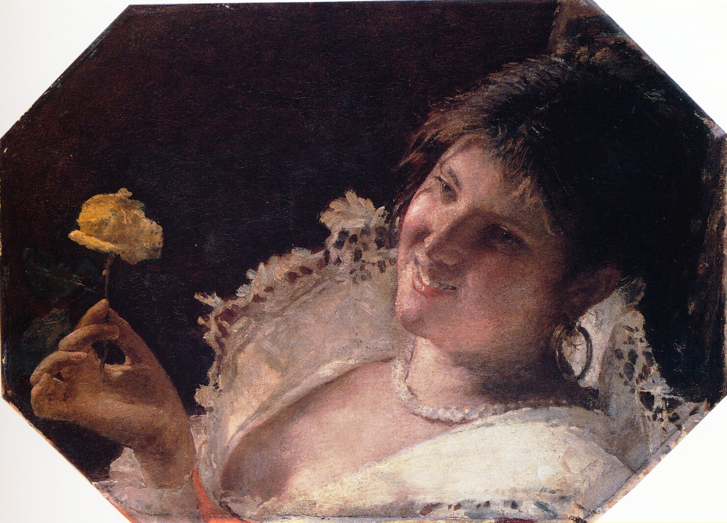 Una ragazza sorridente guarda la rosa che tiene tre le dita. Indossa un abito bianco con colletto di pizzo, collana di perle, orecchino ad anello