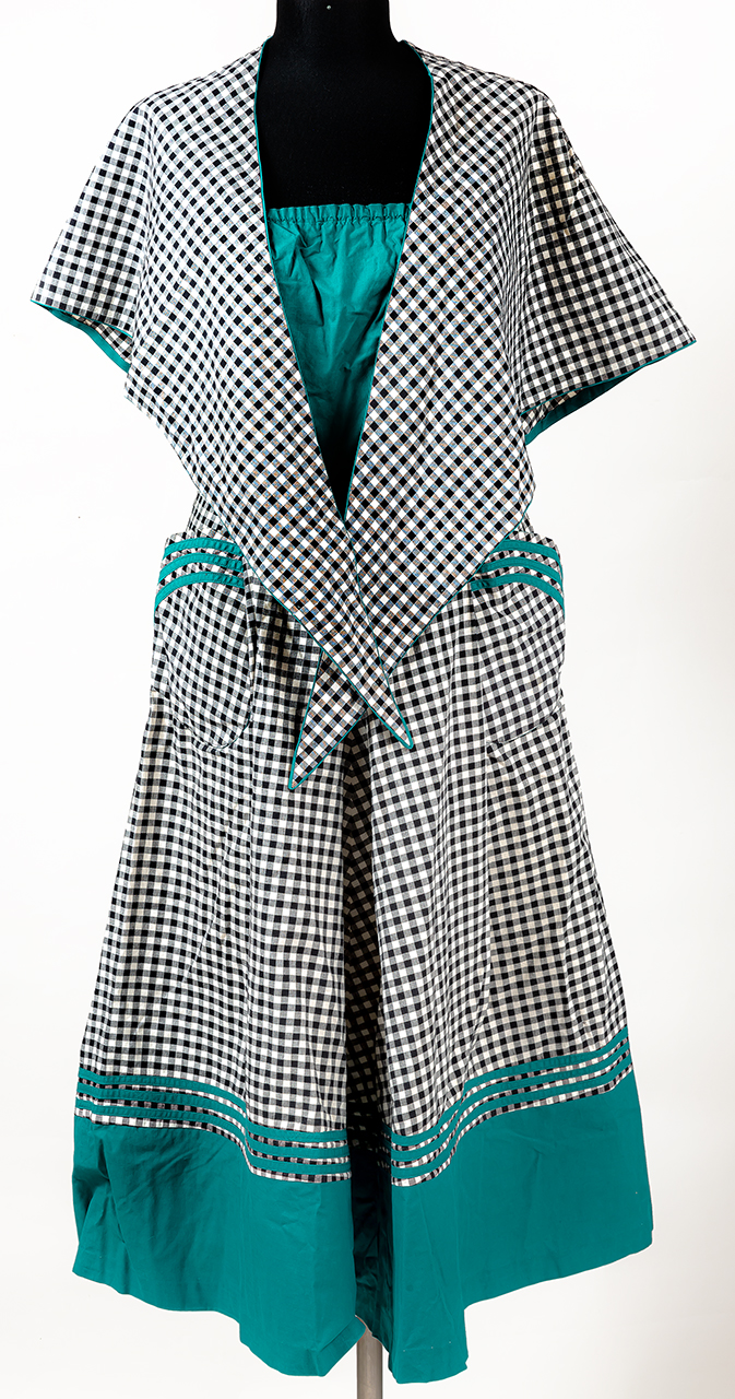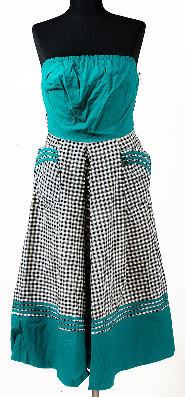 Abito intero corto al ginocchio in tela di cotone verde e in tela di cotone a quadretti Vichy bianchi e neri. Corpino con scollo totale diritto munito di elastico; davanti in tela verde con pinces, dietro in tela Vichcy con impunture in filato nero. Taglio inferiore diritto. Gonna svasata in 4 teli in tessuto a quadretti, con due pieghe centrali, terminante in un'alta fascia in tela verde preceduta da tre nastri decorativi dello stesso tessuto. Analoghi nastri ornano le due tasche laterali stondate. Apertura laterale sinistra con un bottone in madreperla e cerniera in metallo. All'interno del corpino, sulle cuciture laterali, sono presenti due asole realizzate con il tessuto a quadretti