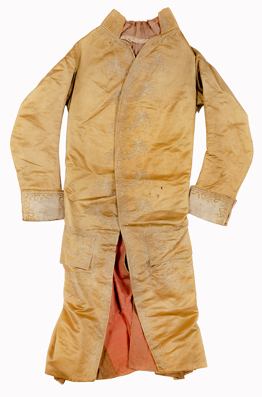 Marsina con spacco posteriore (h. 49) e gheroni, con apertura frontale e colletto dritto. Il capo è confezionato in raso di seta giallo chiaro ricamato in seta avorio a punto raso/pittura. Il ricamo corre lungo tutta l’apertura, sul retro lungo lo spacco e sulle tasche applicate e presenta motivi di nastri a ghirlanda che fanno fiocchi con fiorellini e spighe. Le maniche lunghe presentano ampi risvolti in raso di seta avorio, decorati dal medesimo ricamo del resto della marsina ma in seta gialla. La marsina è foderata internamente da più pezzi di stoffa diversi: la maggior parte è in raso di seta salmone; il dorso e le spalle sono in saia di seta rosa più chiaro e la zona delle ascelle in taffetas di seta rosso