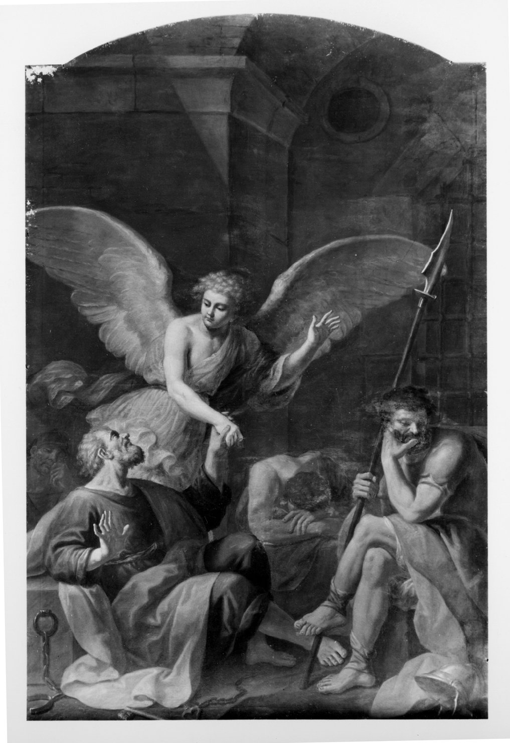 Interno di cella, entro la quale un grande angelo, ad ali spiegate e in veste rosa, porge la mano a San Pietro, seduto a terra, in veste verde e manto giallo; vicino sono i ceppi, a terra le chiavi. Intorno soldati dormienti: uno a destra, con manto rosso e lancia, è seduto con il capo appoggiato alla mano; un secondo , dietro ha reclinato il capo sulle braccia; il terzo a sinistra nel fondo