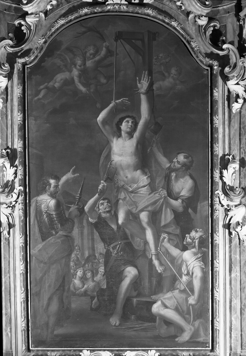 Il Santo è al centro, visto di fronte, ignudo, lo sguardo al cielo e l'espressione serena; è sollevato per mezzo di corde legate alle mani, tirate da uomini raffigurati più in basso, in atteggiamenti vari; il fondo è scuro: in alto, entro un gruppo di nubi illuminate da una luce calda, sono alcuni angeli