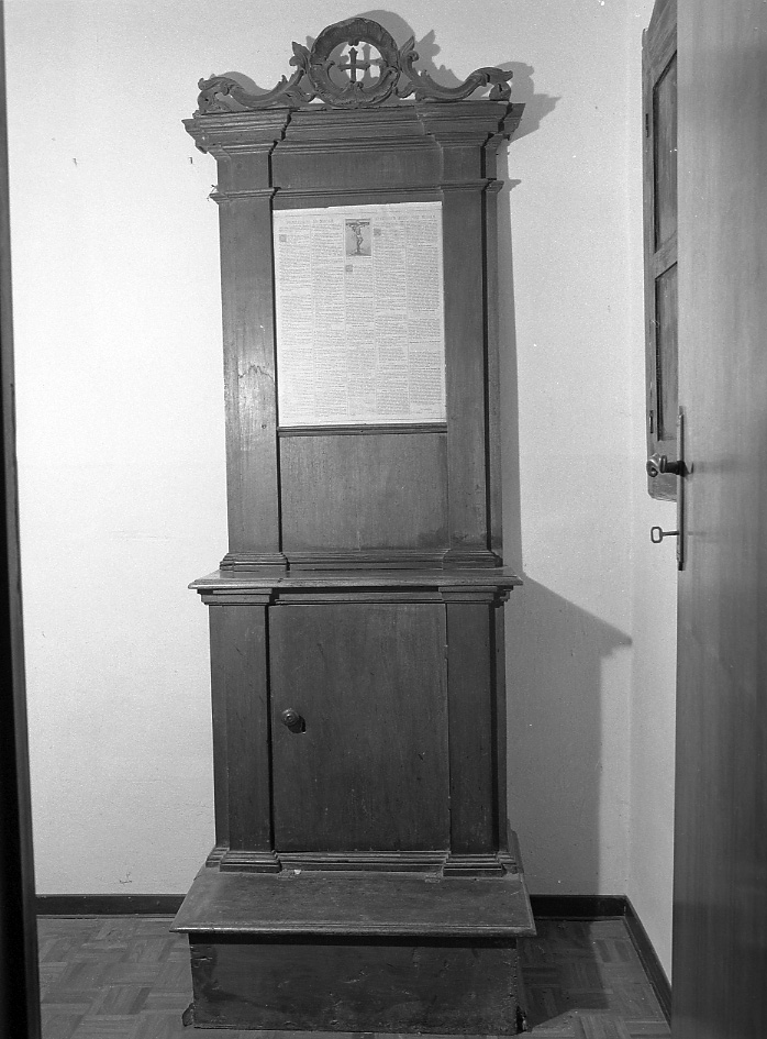 Due inginocchiatoi con alzata nella quale sono incorniciate antiche stampe con preci per la preparazione alla messa da recitarsi da parte dei sacerdoti. Le alzate sono delimitate da lesene con cornice terminale su cui si posa una cimasa a volute contrapposte con cerchio ad aureola in cui si trova una croce