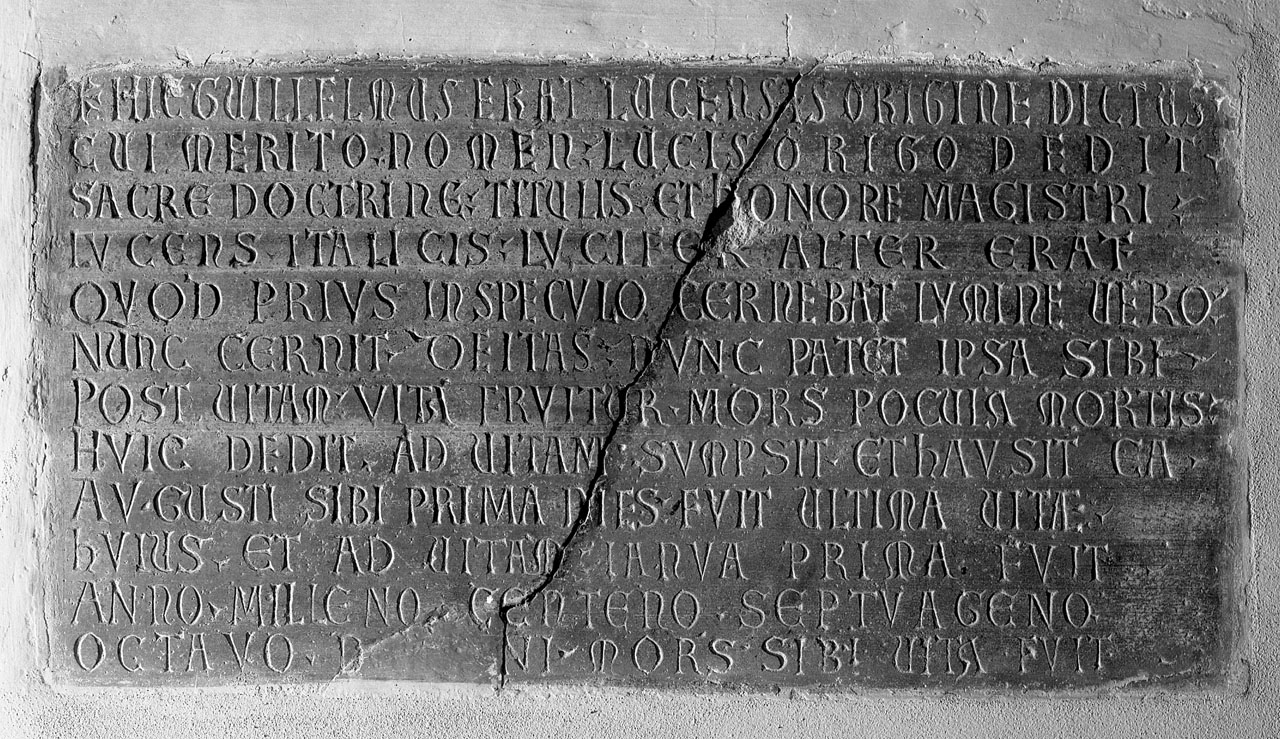 - ISCRIZIONI (CRISMON) HIC GUILLELMUS ERAT LUCENSIS ORIGINE DICTUS/ CUI MERITO NOMEN: LUCIS ORIGO DEDIT/ SACRE DOCTRINE TITULIS ET HONORE MAGISTRI7 LVCENS ITALICIS: LVCIFER ALTER ERAT/ QVOD PRIVS IN SPECVLO CERNEBAT LVMINE VERO/ NUNC CERNIT DEITAS NVNC PATET IPSA SIBI/ POST VITAM VITA FRVITUR MORS POCULA MORTIS/ HVIC DEDIT AD VITAM SVMPSIT ET HAVSIT EA/ AVGUSTI SIBI PRIMA DIES FVIT ULTIMA VITAE/ HVIUS ET AD VITAM IANVA PRIMA FVIT ULTIMA VITAE/ HVIUS ET AD VITAM IANVA PRIMA FVIT/ ANNO MILLENO CENTENO SEPTVAGENO/ OCTAVO D(OMI)NI MORS SIBI VITA FVIT - a incisione -