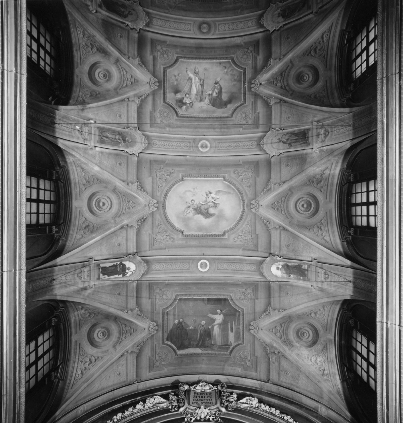La copertura a botte della chiesa è scandita da una decorazione a finta architettura, a monocromo. Sono in evidenza cinque campiture : tre scene della vita di san Gregorio, due sfondati con angioletti tra nubi.Entro finte nicchie, alla base dei costoloni dipinti, sono le figure degli apostoli