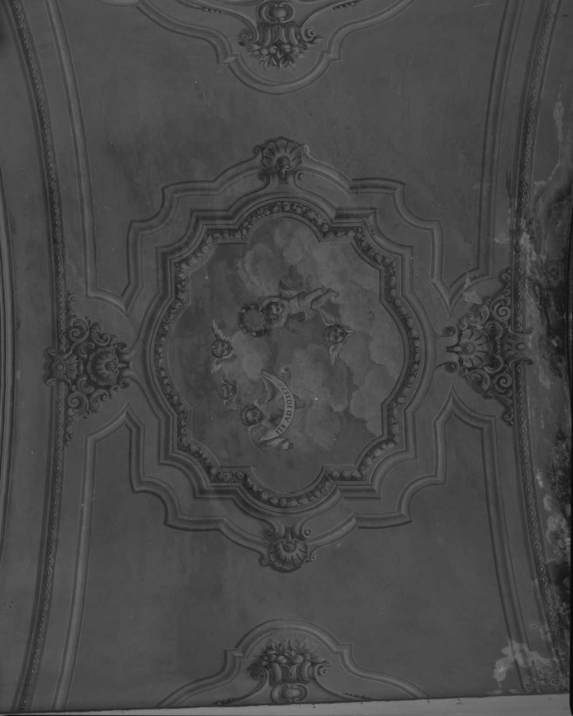 Entro un medaglione, putti festanti tra le nuvole reggenti corone di fiori. Quello sulla sinistra ha un cartiglio con la scritta "ITE AD JOSEPH"