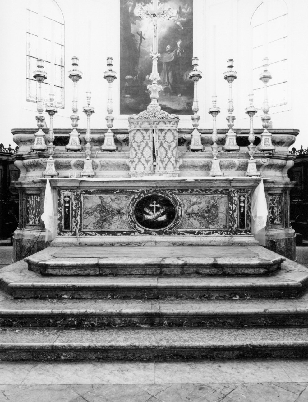 Altare maggiore in marmi policromi limitato da fasce di marmo rosso di Francia che nel paliotto incorniciano fondi di marmo giallo e verde antico. Le parti laterali sono costituite da cornici in marmo rosso veronese con fondi di marmo giallo e rosso di Francia. I gradini antistanti presentano incrostazioni con gli stessi marmi