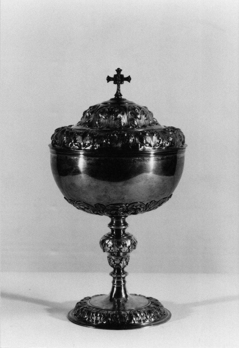 Piede con base a sezione circolare con fascia bombata a foglie e sottofoglie lavorate a sbalzo Tra due collarini nodo strozzato con due giri di foglie e sottofoglie; coppa con motivo a girali vegetali; coperchio bombato a due risalti decorati da foglie e sottofoglie lavorate a sbalzo. Crocetta apicale