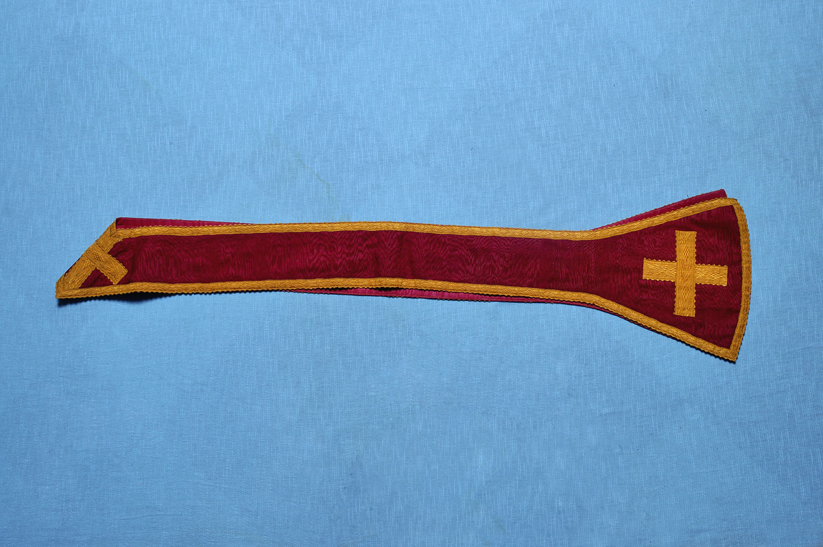 seta rossa damascata, i fiocchi sullo spallo del piviale e la trina che segna i profili del piviale e della stola sono in cotone giallo