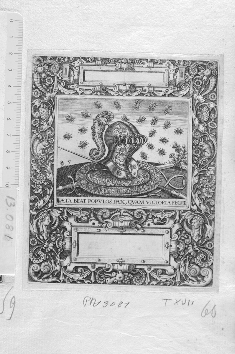 Decorazioni. Oggetti: elmo. Animali: mosche