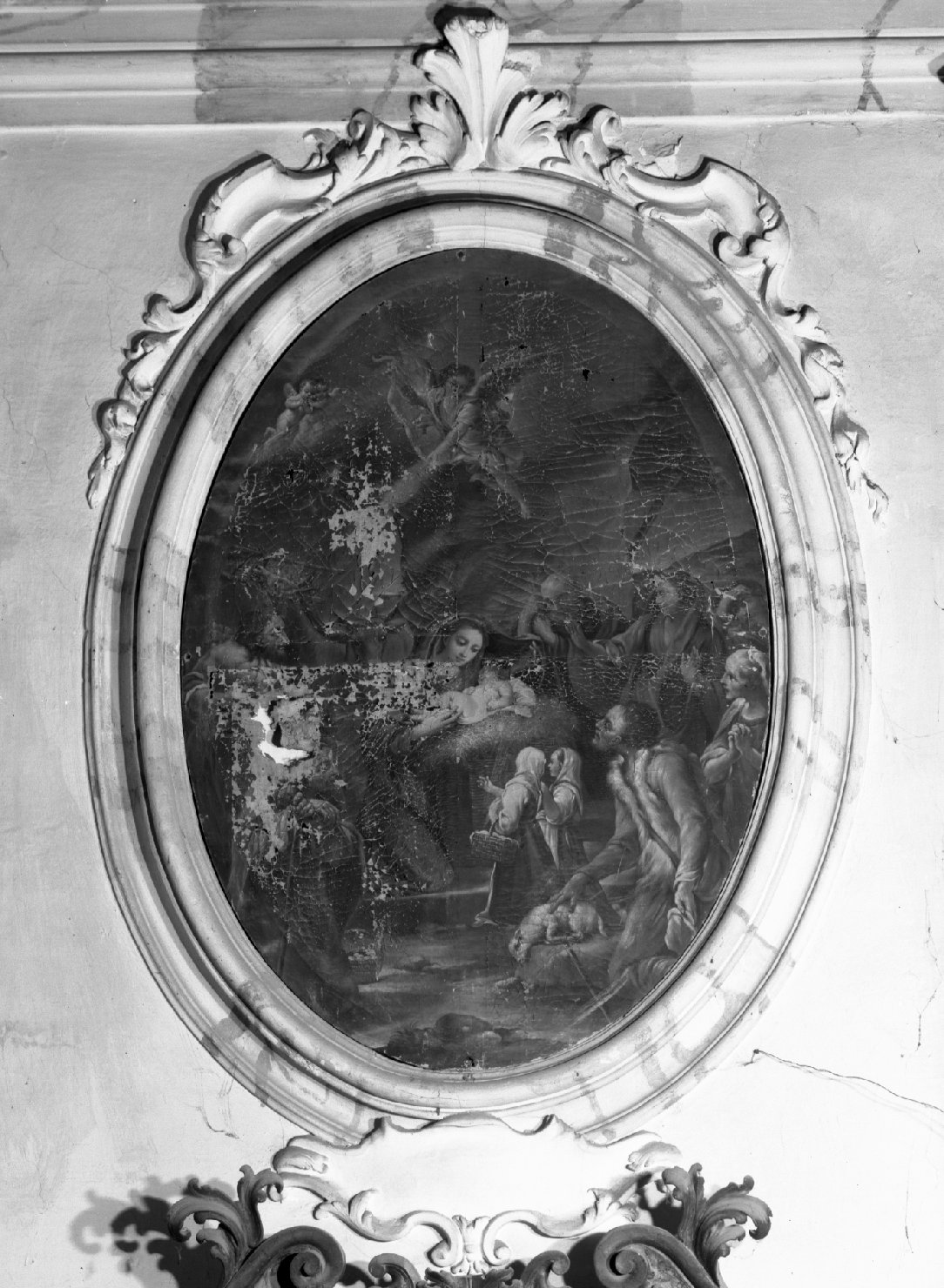 Al centro San Giuseppe e la Vergine inginocchiata reggente il Bambino; ai lati figure di pastori e donne inginocchiate e adoranti (alcune illeggibili). In alto appaiono un angelo in volo con cartiglio e due cherubini. Entro cornice ovale in stucco