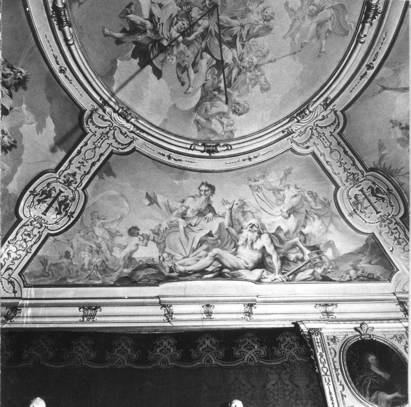 Motivi ornamentali, grifi etc., al centro una cornice ovale e lateralmente cornici mistilinee racchiudenti un'affresco