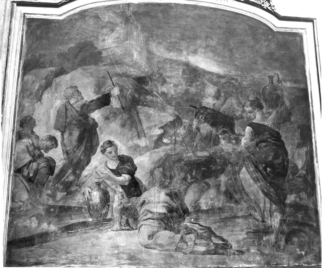 Personaggi: Mosè. Figure: popolo d'Israele. Oggetti: anfore. Animali: asino. Paesaggi: rocce
