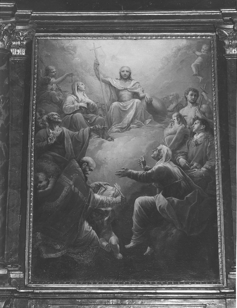 Personaggi: Cristo; Madonna; S. Michele Arcangelo; S. Giovanni Battista; San Pietro; S. Stefano; S. Agostino; S. Monica. Attributi: (S. Michele Arcangelo) lancia; bilancia; (S. Giovanni Battista) agnello; croce astile; (San Pietro) chiavi; (S. Stefano) sassi; (S. Agostino) libro; abiti vescovili. Figure: angeli. Fenomeni naturali: nubi. Fenomeni divini: luce