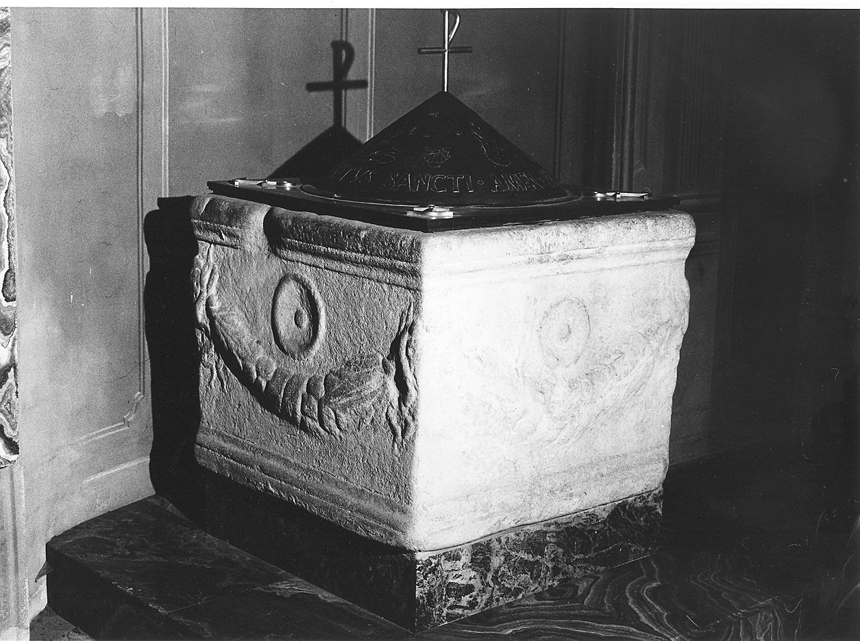 - NOTIZIE STORICO CRITICHE Si può supporre, come per gli altri monumenti romani rinvenuti in città e nel contado, una provenienza locale. Secondo M. M. Calvani (1979) lo stile della decorazione fa propendere per una datazione di epoca Giulio-Claudia. Più precisamente la sostituzione delle teste d'ariete ai bucrani colloca l'opera nell'età di Claudio. La base di monumento probabilmente funebre fu trasformata nel 1959 in fonte battesimale. Lo spostamento dall'orto del monastero avvenne su ordine di padre Paolino Beltrame Quatrocchi (parroco dal 1958 al 1961)