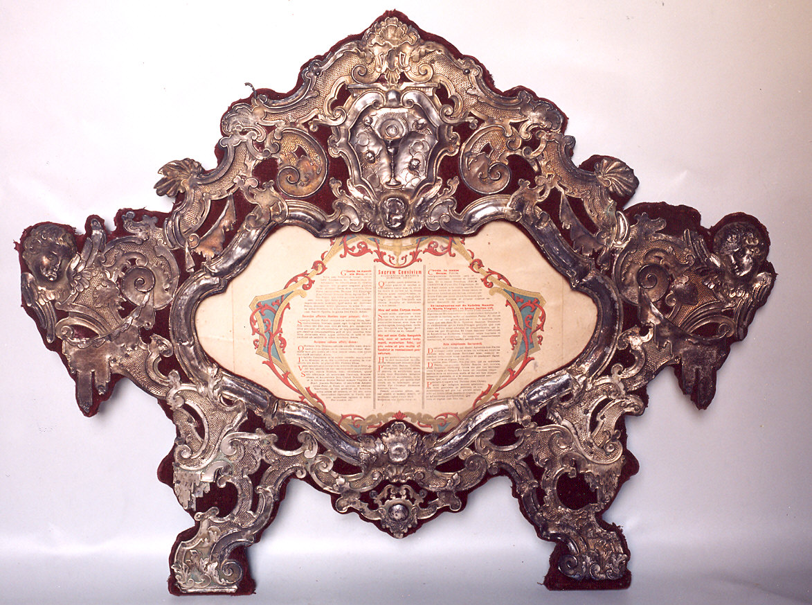 - NOTIZIE STORICO CRITICHE Bel lavoro di gusto pienamente settecentesco nella linea mossa e nel composito gioco ornamentale, che utilizza con felice invenzione i tipici elementi del lessico rocaille. Pur in un disegno equilibrato, la decorazione raggiunge esiti di dinamismo e leggerezza in genere estranei al calibrato barocchetto locale, grazie anche a una tecnica esecutiva di notevole qualità, capace di trattare in modo variato le superfici con un buon effetto di contrasto chiaroscurale. Non è infondato supporre autore della serie ancora Domenico Barbieri, uno degli artefici parmensi più dotati e più sensibili, a queste date, al gusto rococò .Così come è verosimile che le cartegloria vadano identificate con " le tre tavolette d'argento d'altare" citate nel legato del Marchese e canonico Giuseppe Manara, che alla sua morte, nel 1786, lasciò al Capitolo un patrimonio di oggetti e parati stimati circa 15000 lire, con la preghiera di utilizzarli soprattutto nelle festività solenni (cfr Allodi 1856, pp.403-404)." Una muta di tavolette di legno con lastra d'argento" comincia infatti ad essere registrata dagli inventari a partire da quello del 1790