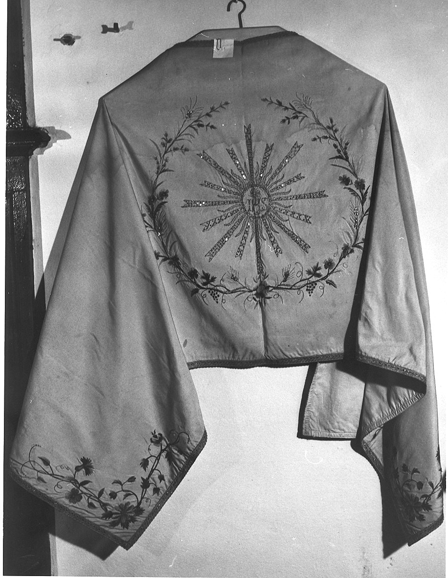 Disegno: al centro monogramma di Criso entro raggiera dorata contornata da una ghirlanda a tralci di vite con grappoli, spighe e fiori. Ai quattro angoli rami fioriti con garofani. Tessuto: gros di seta bianco, ricami in sete rosse, viola e vinaccia, a punto pieno, erba e steso. Placchette e paillettes dorate. Gallone dorato. Fodera di cotone bianco