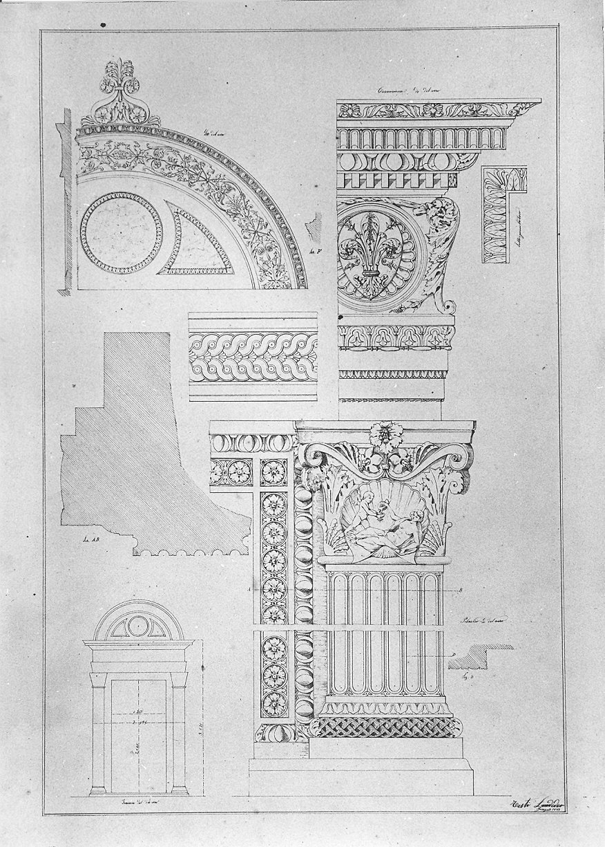 Elementi decorativi di portale del Quattrocento fiorentino. In basso è presentato l'insieme del portale; a parte i particolari del "pilastro", della lunetta di coronamento, del "cornicione" e una sezione del piedritto