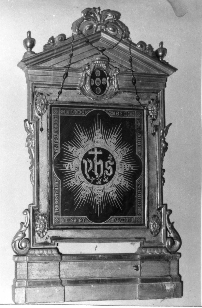 Dipinto su tavola, fondo azzurro, fregiato in oro, con il monogramma detto di S. Bernardino. Inserito in cornice a tempietto in legn intagliato, completamente dorato, con alcuni fondi lisci dipinti in azzurro. Nella parte superiore è inserito un reliquiario. Presenta iscrizione dipinta intorno al monogramma