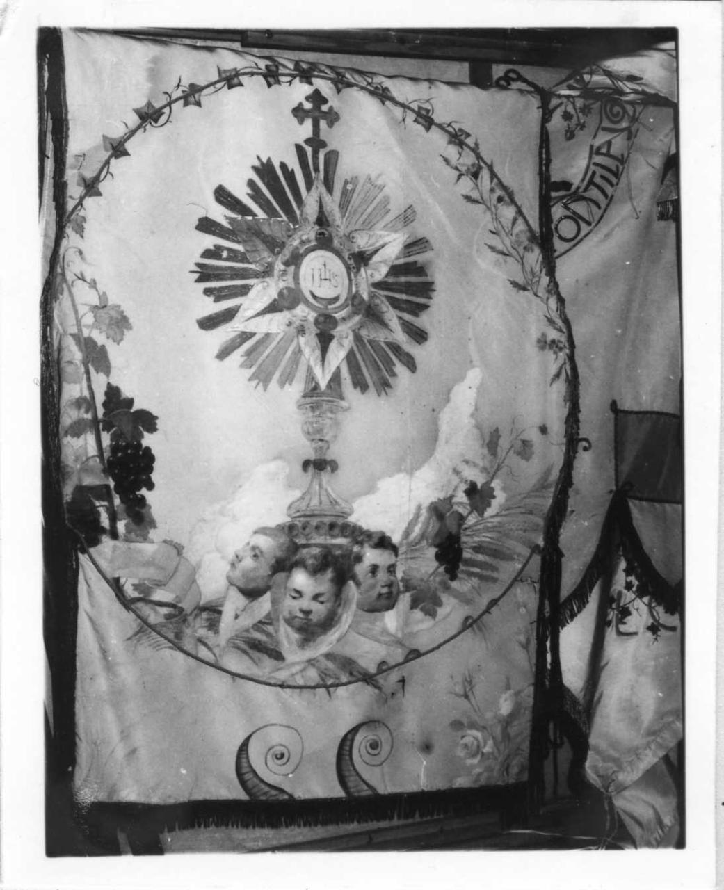 Stendardo, ora rettangolare, ma ritagliato nei bordi, forse era una grande bandiera. Medaglione formato da un serto di foglie d'edera con spighe, annodate a nastri azzurri. Tre cherubini reggono un ostensorio dorato, il fondo è il cielo con nubi e resa bianca uniforme. Frange dorate