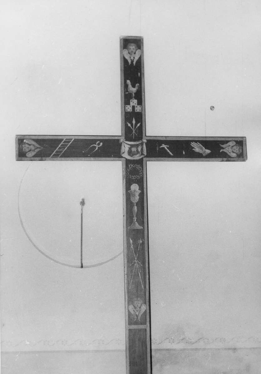 Legno verniciato in nero con dipinti in bianco a monocromo sfumato i simboli della passione. Nei bordi listatura in colore giallo