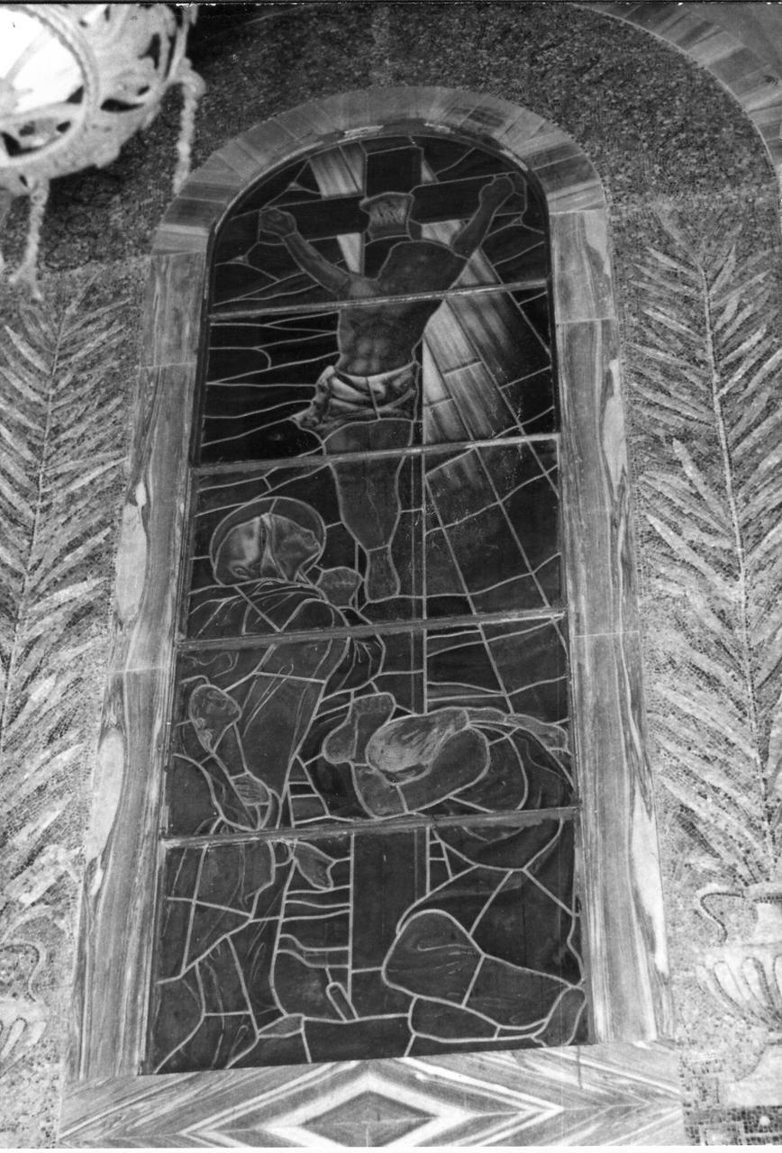 Vetri policromi a fuoco legati da piombo. Il fondo è azzurro intenso tenebroso rischiarato da un fascio di luce gialla. I colori sono violenti nelle tonalità verde, azzurro, rosa, rosso, violetto e giallo