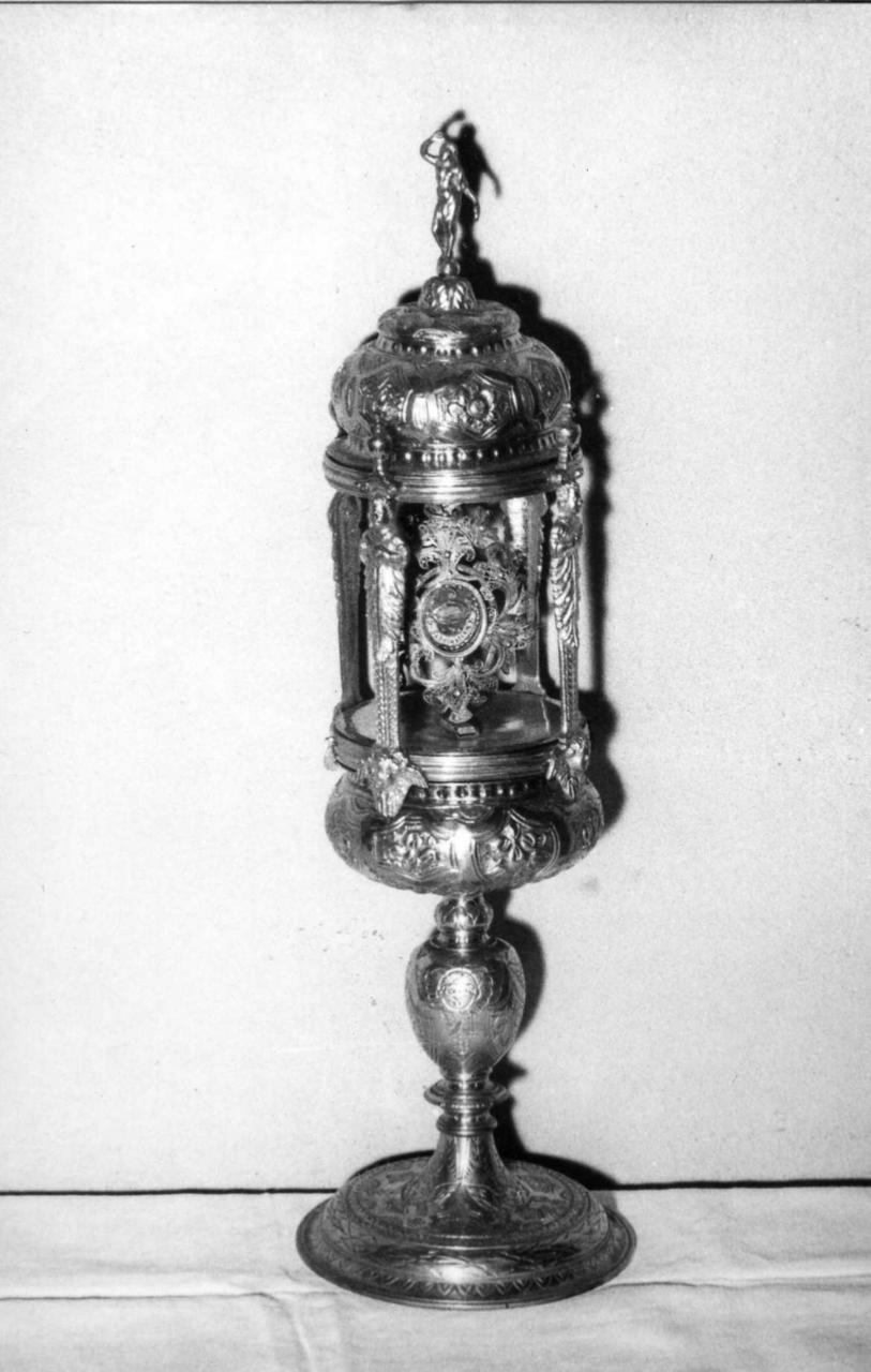 Il reliquiario mostra piede tondo e stelo a bulbo. Foglie, motivi geometrici e teste d'Angelo sono graffiti. Il corpo a tempietto rotondo è scandito da quattro cariatidi ed è concluso da una cupoletta sormontata dalla statuetta di Cristo