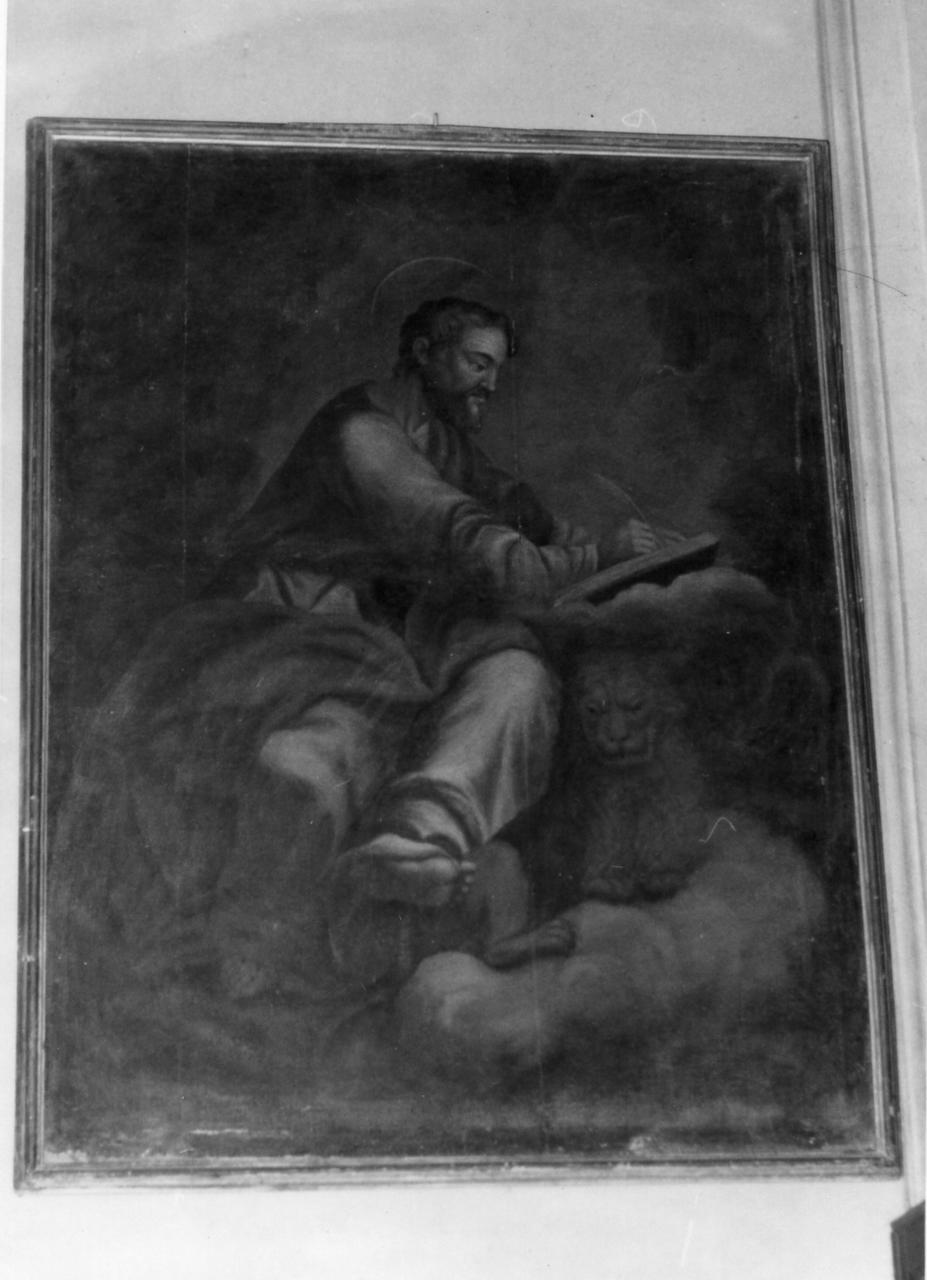 San Marco, in veste rosacea e manto giallo, è raffigurato in atto di scrivere il Vangelo; ai suoi piedi il leone. In cornice di legno, dorata