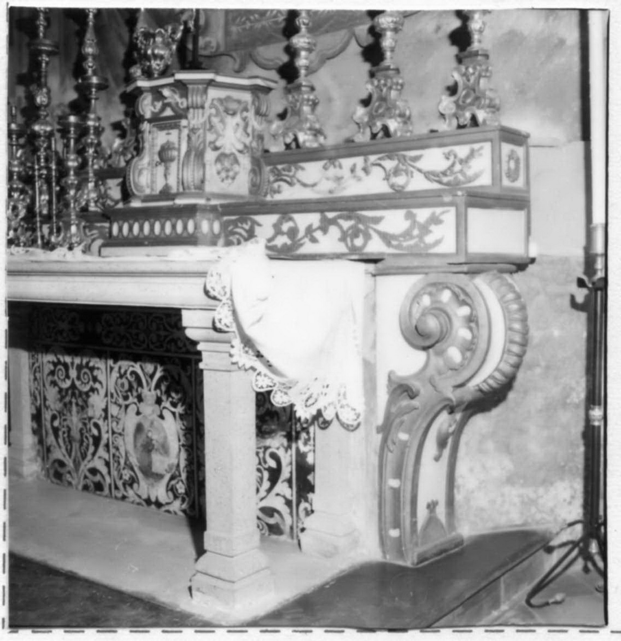 L'altare è a due scaffe, con riccioli laterali e completo di tabernacolo. I gradini recano decorazione in legno, a motivi vegetali e rosette, applicata. Il complesso è dipinto di bianco e dorato a vernice
