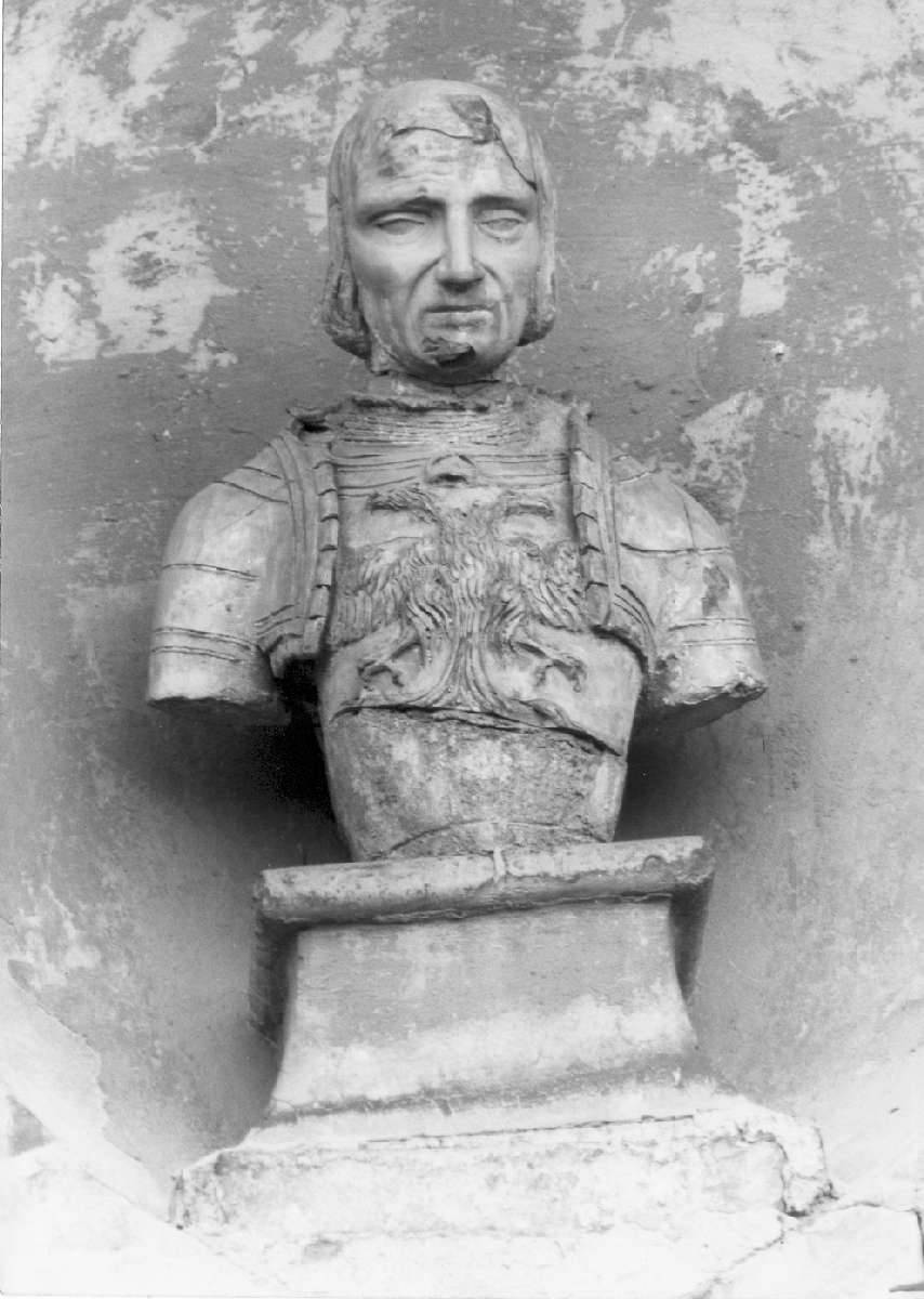 - NOTIZIE STORICO CRITICHE La serie di sculture che ornano le nicchie poste a decorazione del belvedere, sono opera di mano ignota e di non grande levatura. Dalle fotografie storiche del palazzo, si evince che pure l'altro terrazzo aveva un'ornamentazione analoga rimossa all'inizio del '900 a seguito della costruzione di una struttura muraria. I busti, riconducibili stilisticamente al personaggio con l'ermellino, rappresentano dei guerrieri di casa d'Este e sono databili agli anni dell'adattamento delle vecchie torri a belvedere (1644-1651)
