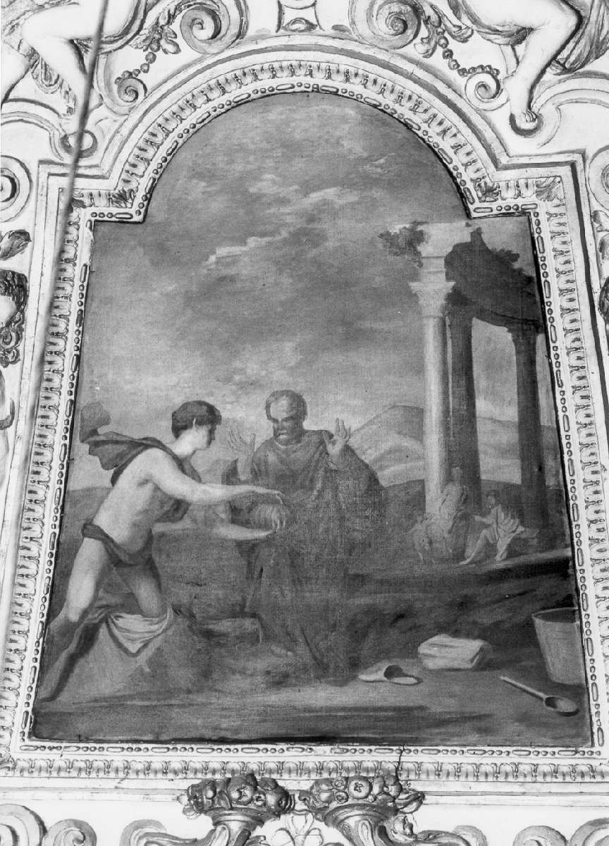 Sulle rive delle acque, in primo piano, un nudo maschile mostra una zucca di pietra ad un vecchio drappeggiato nel manto rosso che leva le braccia in segno di meraviglia, Accanto alcuni oggetti pietrificati e sullo sfondo altre figurine ai piedi di una rovina classica